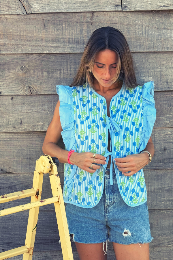 Colete leve mas estruturado, com padrão floral e cores claras. Com suave estrutura quilted, e um folho azul em todo o comprimento e dar um acabamento especial.