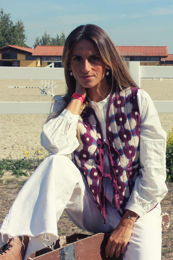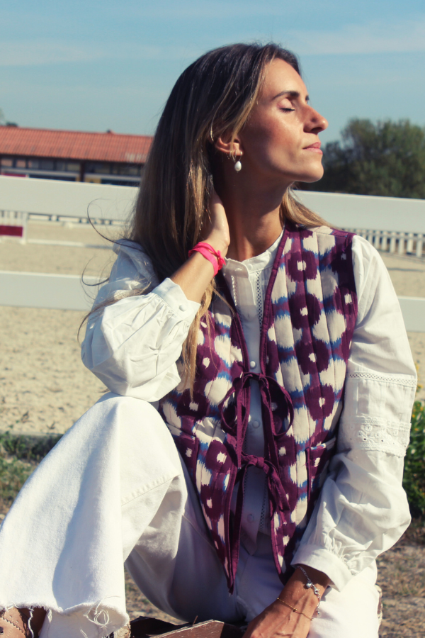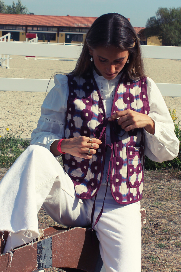 Colete leve mas estruturado, com padrão étnico em tons de branco e azul, em fundo bordeaux. Com suave estrutura quilted, perfeito para dar um apontamento a qualquer look.