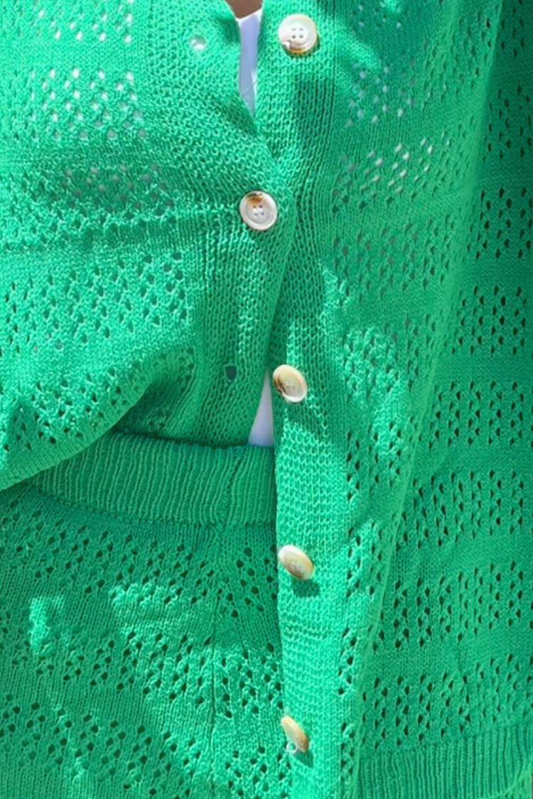 Conjunto composto por calças de corte reto e camisa de manga curta, em algodão rendilhado. Disponível em verde ou preto.