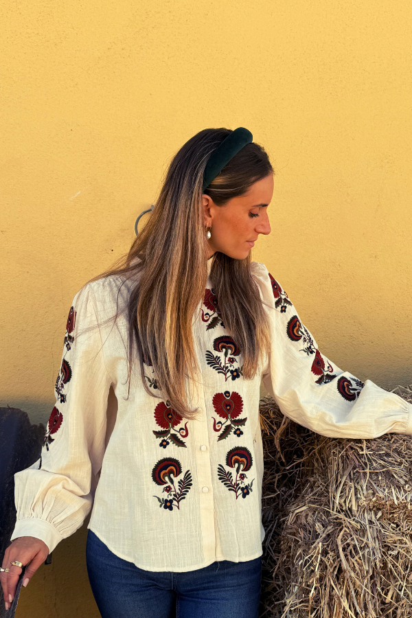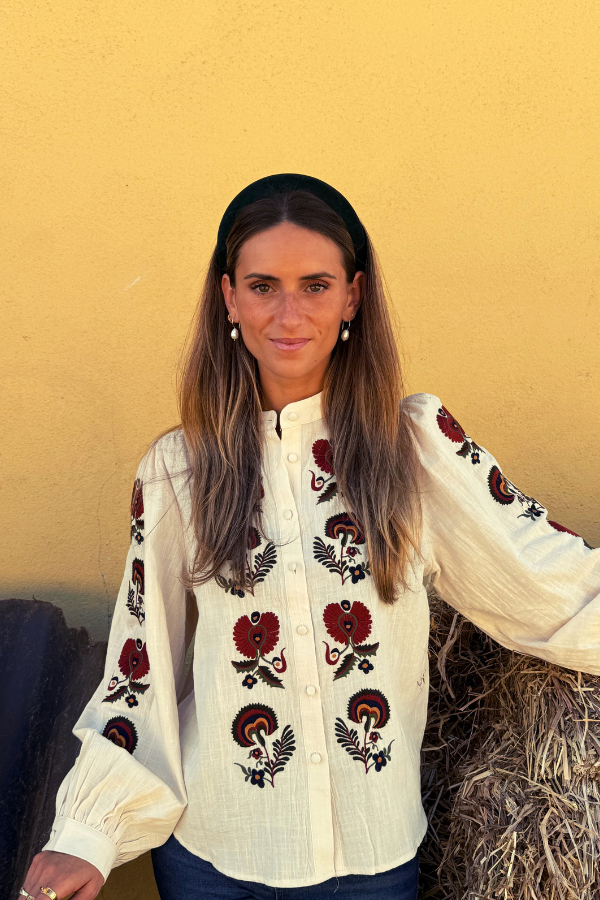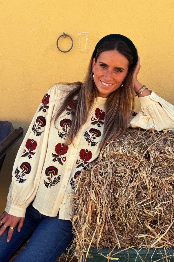 A Túnica Beloura em tom creme com bordados florais em tons de Outono, ao longo das mangas e frente.
