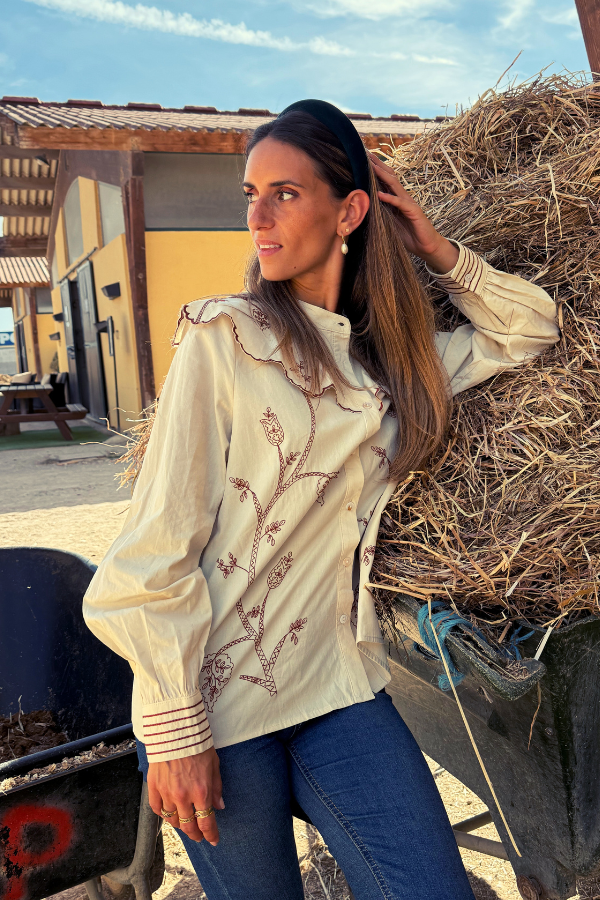 Túnica em beige, com pequenos bordados florais em tom ferrugem, e uma gola ondulada icónica. De mangas compridas e punho abotoado, com linhas bordadas.
